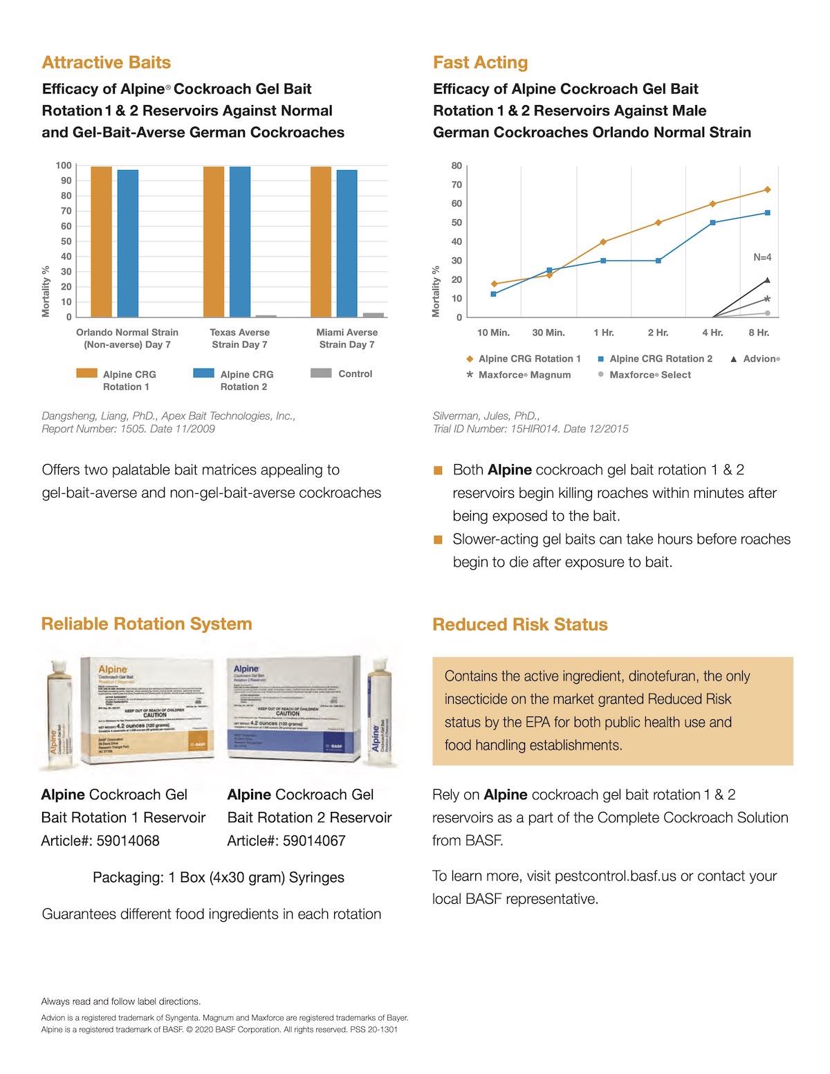 Alpine Cockroach Gel Bait Rotation 1 Reservoir was the first roach gel labeled Reduced-Risk by the EPA, meaning the active ingredient is safer around people, pets and the environment, yet is tough on household roaches. In fact, roaches almost can't resist the bait formulation of Alpine, and once they feed on the bait they will transfer it to other roaches causing eventual death. Alpine Roach Gel will start killing roaches within hours after contact. Alpine even attracts bait-averse cockroaches. Labeled for use indoors and outdoors and even sensitive areas such as food-handling establishments, food and feed processing plants, hospitals and nursing homes.